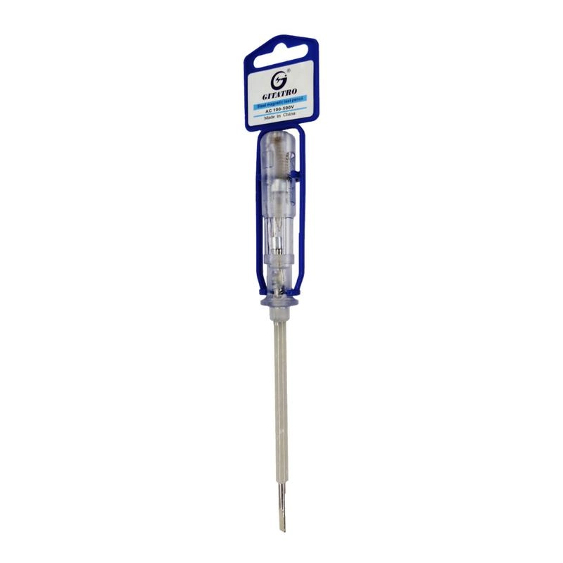 این محصول، فازمتر جیتاترو Gitatro می باشد. این فازمتر، با 20 سانتیمتر طول، یک فازمتر بزرگ و بسیار خوشدست بوده و برای انجام کارهای برقی بسیار مناسب است. دامنه کاری این ابزار، بین 100 تا 500 ولت است و دستهی این ابزار نیز طوری ساخته شده که بهراحتی در دست مینشیند و فازمتر درون مشت شما سر نمیخورد. فازمتر جیتاترو Gitatro معرفی شده به عنوان (steel magnetic test pencil)، هم اکنون در رنگبندی نقره ای، موجود و قابل سفارش است.