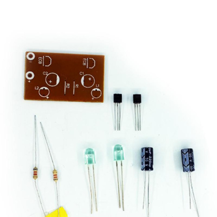 این محصول، کیت چشمک زن دوتایی به همراه جزوه آموزشی مراحل ساخت محصول می باشد. محتویات این بسته شامل مقاومت 8.2 کیلواهم، خازن شیمیایی 330 الی 470 میکروفاراد، ترانزیستور منفی C945، دیود نورانی (LED) و... است.
